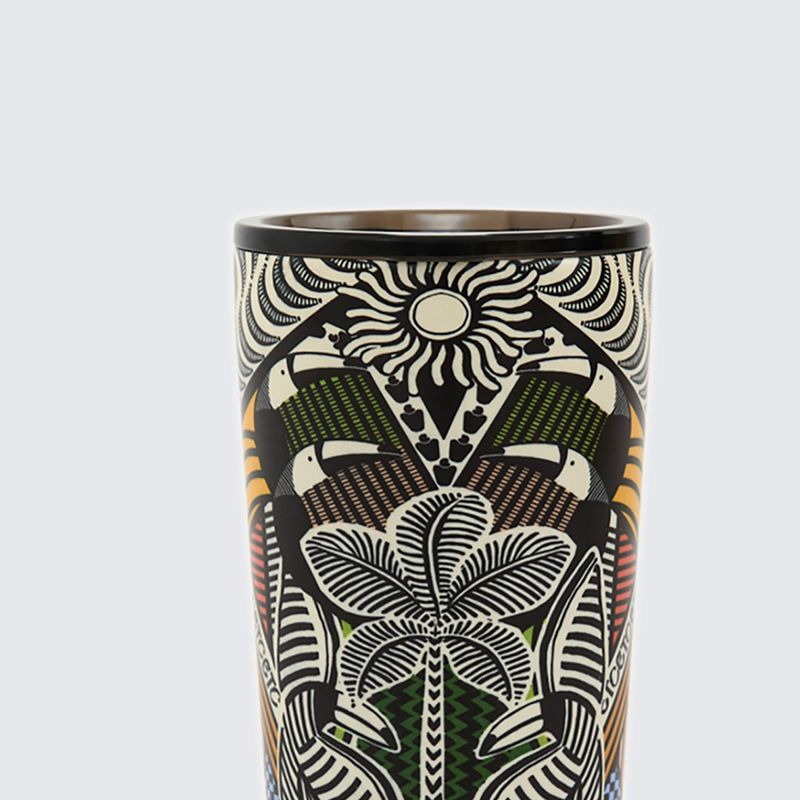 Desenvolvido para o público Feminino que busca acessórios marcantes, o copo possui um formato anatômico que se encaixa perfeitamente nas mãos. A combinação do fundo preto com os elementos gráficos coloridos cria um contraste sofisticado e moderno, tornando-o o acessório indispensável para quem quer levar a energia solar da Farm para todos os lugares.