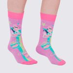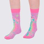 Confeccionada em algodão de alta qualidade, a meia oferece um toque macio e excelente conforto, permitindo que os pés respirem livremente durante todo o dia. Na cor lilás, que é tendência absoluta, ela apresenta um acabamento estampado único, inspirado na força e no brilho das "Guerreiras do K-Pop", tornando qualquer look mais moderno e divertido.