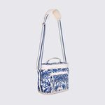 O design do Mini Cooler Farofa se destaca por seu formato compacto e eficiente, ideal para piqueniques, praia ou piscina. A estampa "Coqueiro de Flor" traz um visual alegre e suave, combinando a exuberância dos coqueiros com flores delicadas em um fundo azul, conferindo um toque moderno e feminino. O material em Poliester com forro térmico garante que o conteúdo seja mantido refrigerado. Com volume de 5 Litros, ele oferece o espaço ideal para algumas bebidas e lanches. A alça superior e a alça transversal garantem praticidade no transporte.