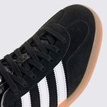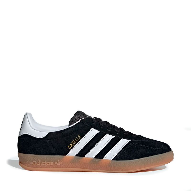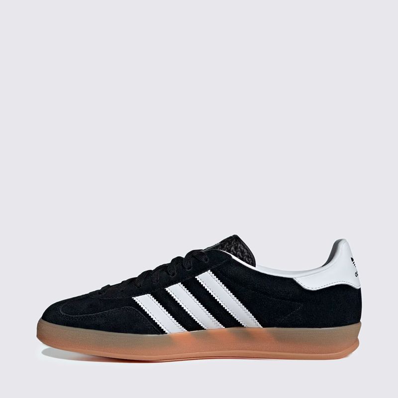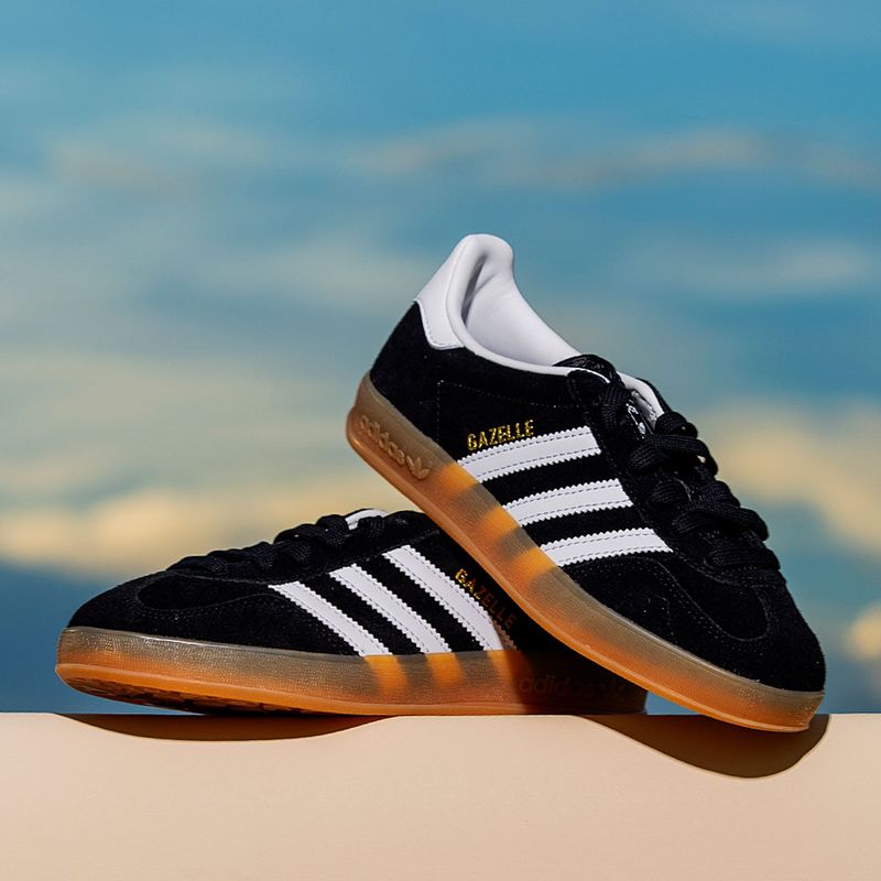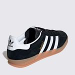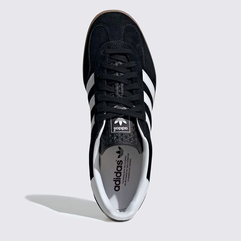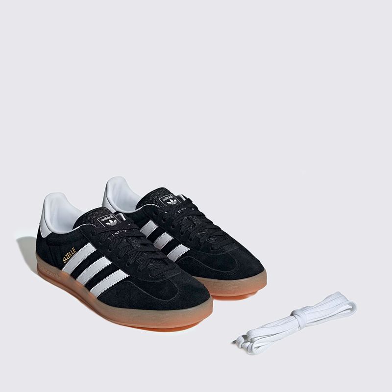 Confeccionado com uma combinação de couro e camurça de alta qualidade, o Gazelle Indoor oferece durabilidade e um toque texturizado premium. A cor preta (Core Black) com as icônicas listras brancas (Cloud White) confere uma estética clean e versátil. O acabamento é completado pelo icônico solado de borracha natural de cor caramelo (Gum), que garante aderência e o visual característico do modelo Indoor.