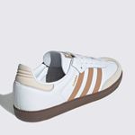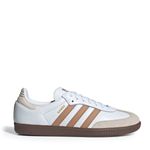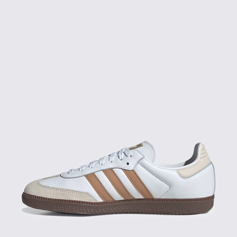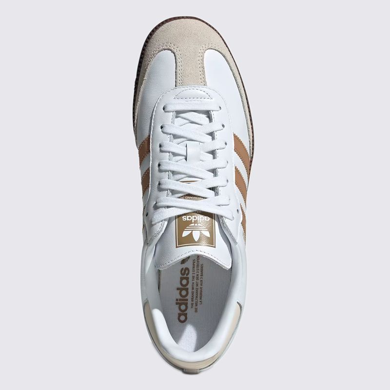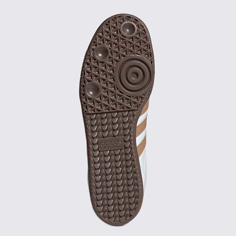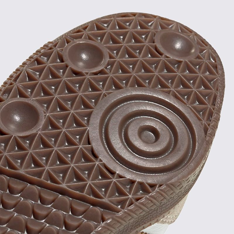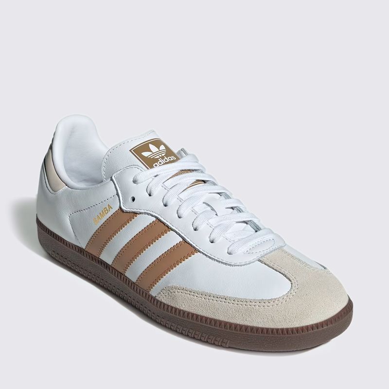 Construído com materiais de alta qualidade, o calçado apresenta cabedal em couro premium, garantindo resistência e um ajuste sofisticado ao longo do tempo. O acabamento em tons de branco (Cloud White) com detalhes em marrom (Cardboard) confere uma estética clean e refinada, enquanto o clássico solado de borracha natural (gum sole) proporciona excelente tração e aquele visual retrô inconfundível da Adidas.