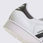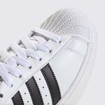 Confeccionado em couro de alta qualidade, o Superstar oferece durabilidade e um toque premium. A cor branca (Cloud White) com as três listras laterais em preto (Core Black) confere uma estética clean e versátil. O acabamento é complementado pelo solado de borracha, que garante aderência e o visual autêntico do modelo.