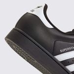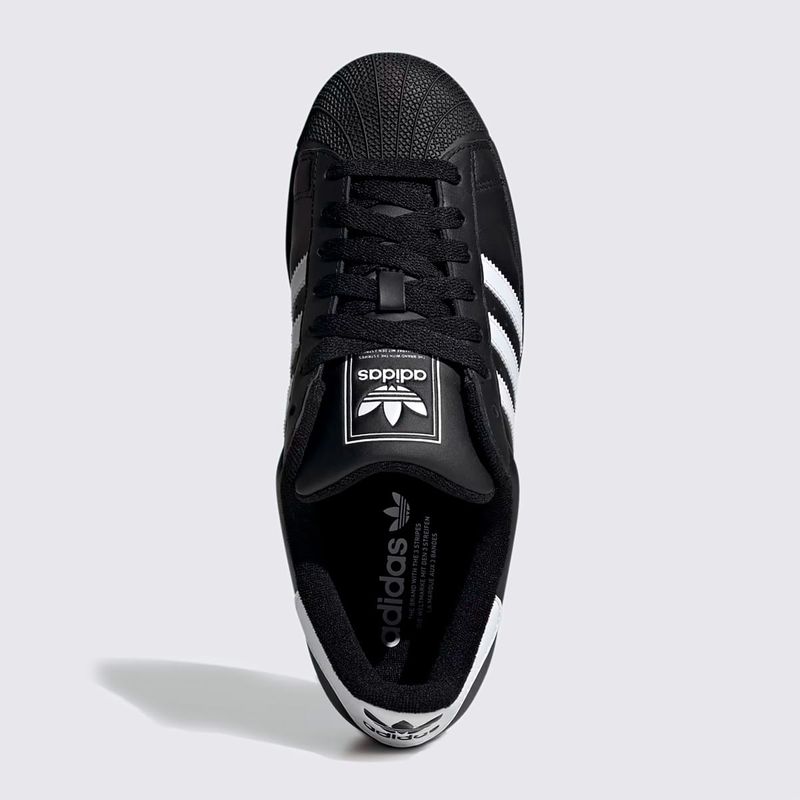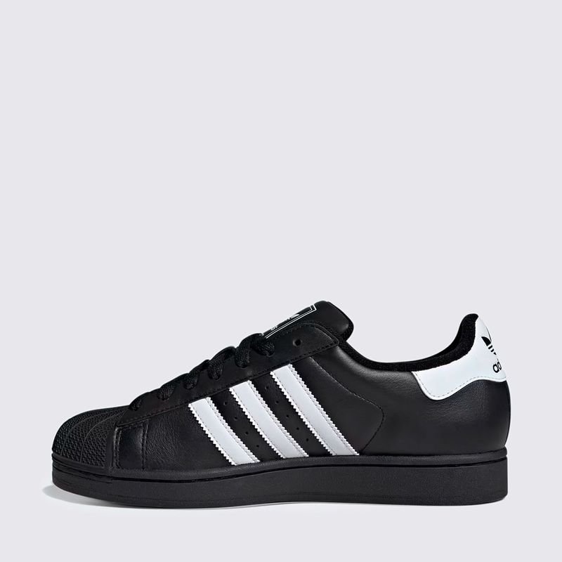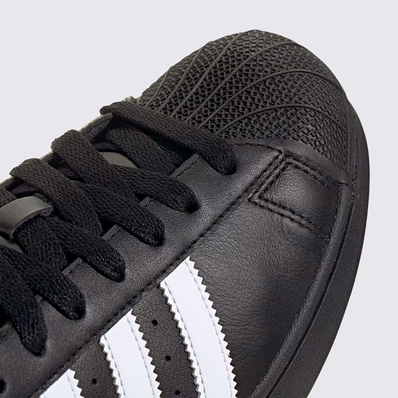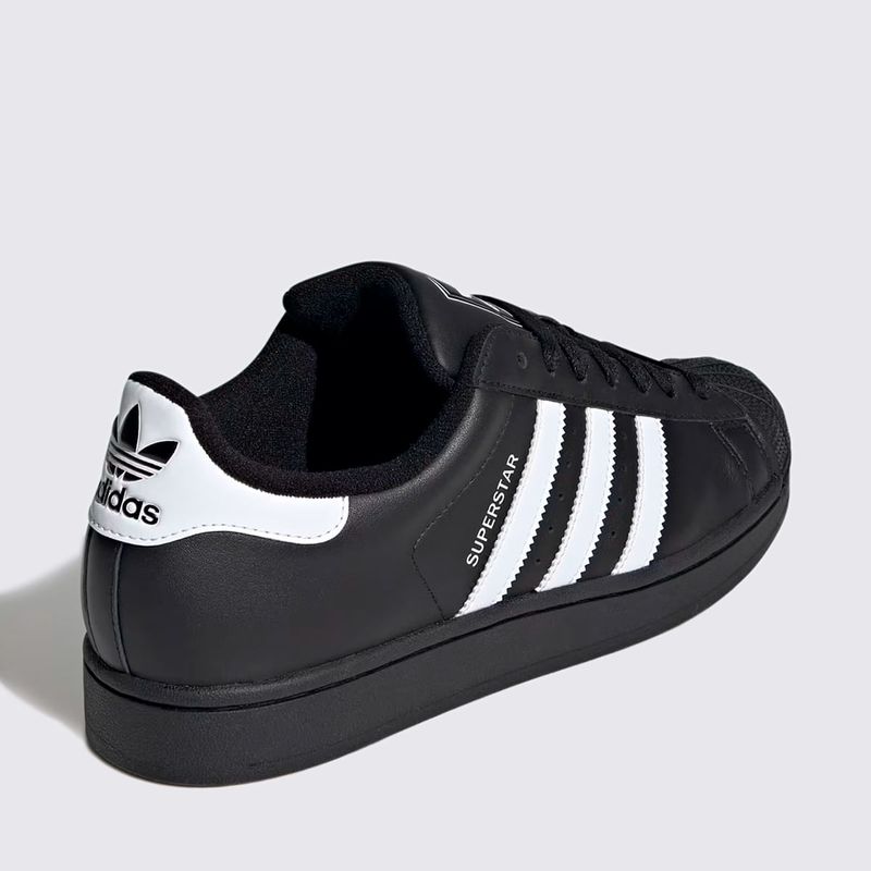Confeccionado em couro de alta qualidade, o Superstar oferece durabilidade e um toque premium. A cor preta (Core Black) com as três listras laterais em branco (Cloud White) confere uma estética clean e versátil. O acabamento é complementado pelo solado de borracha, que garante aderência e o visual autêntico do modelo.