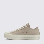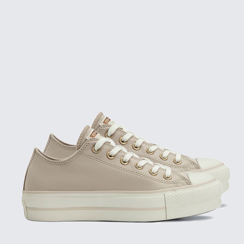 Construído com materiais tradicionais, o calçado apresenta cabedal em lona de alta resistência com acabamento fosco, garantindo durabilidade e um toque suave. O acabamento em tons de bege confere uma estética neutra e orgânica, facilitando as combinações com diversas paletas de cores e estilos da Converse.