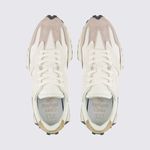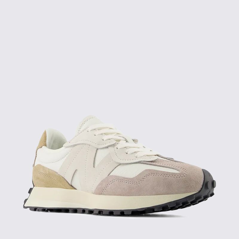 Construído com uma combinação inteligente de materiais, o calçado possui cabedal em sintético de alta performance com acabamento em couro premium, garantindo uma estrutura leve, porém extremamente durável. A cor bege (Moonbeam/Beige) confere uma estética orgânica e sofisticada, enquanto o solado de borracha tratorado, que se estende até o calcanhar, proporciona uma identidade visual única e inconfundível da New Balance.