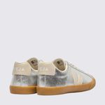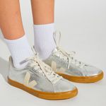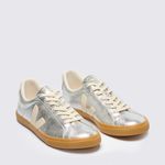 Fiel ao compromisso ético da marca, o modelo é produzido com material sustentável, incluindo couro de alta qualidade com acabamento metalizado. A cor prata reflete uma estética futurista e moderna, enquanto os detalhes em tom Pierre Natural trazem o equilíbrio necessário para manter a elegância característica da Veja, garantindo um calçado com visual premium e excelente durabilidade.