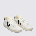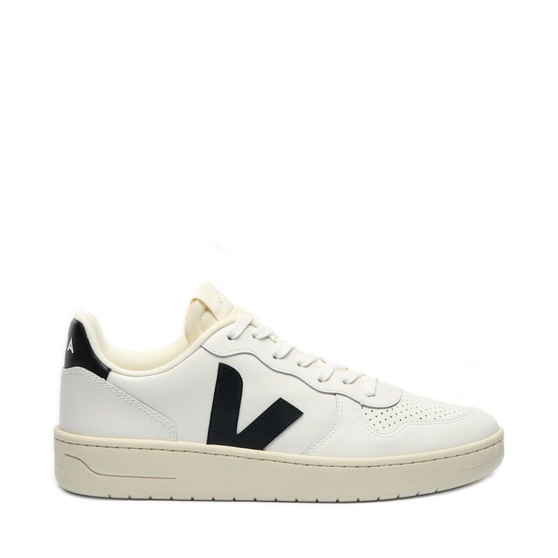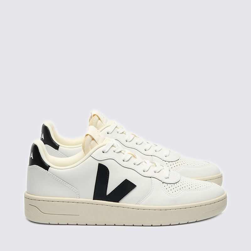 Confeccionado com materiais sustentáveis, incluindo couro sustentável e solado de borracha amazônica, o Veja V-10 oferece durabilidade e um visual premium. A cor branca (Extra White), com o logo "V" lateral em preto, cria um contraste marcante e versátil, fácil de combinar com diversas peças do seu guarda-roupa, garantindo um visual clean e contemporâneo. O acabamento fosco confere uma estética moderna e elegante.