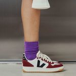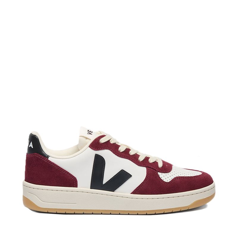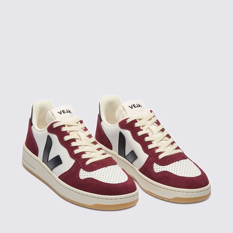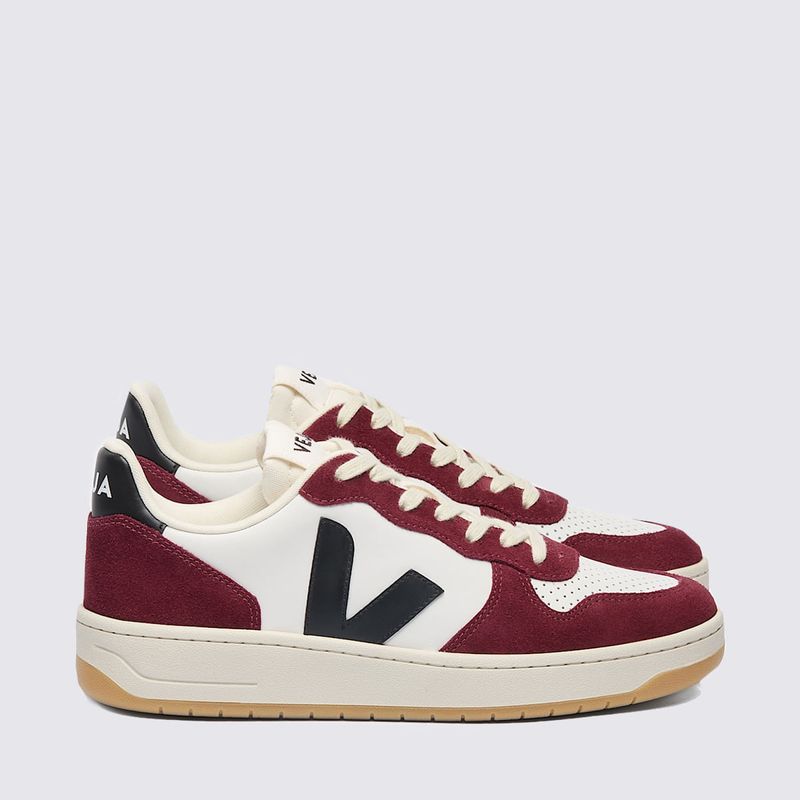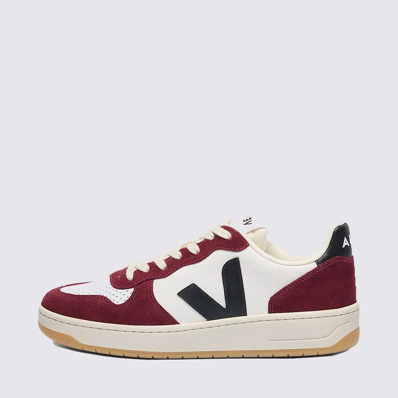 Confeccionado com materiais sustentáveis, incluindo couro sustentável e solado de borracha amazônica, o Veja V-10 oferece durabilidade e um visual premium. A cor branca, com o logo "V" lateral em preto e detalhes em tons de amarante, cria um contraste marcante e versátil, fácil de combinar com diversas peças do seu guarda-roupa, garantindo um visual clean e atemporal. O acabamento em camurça confere uma estética moderna e elegante.