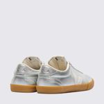 Produzido com material sustentável e couro de origem responsável, o calçado destaca-se pelo seu acabamento metalizado na cor prata (Silver), que reflete luz e atitude a cada passo. Os detalhes em White e Natural equilibram a composição, trazendo a suavidade necessária para que o modelo seja versátil e sofisticado. Além do impacto visual, o couro premium oferece excelente durabilidade e resistência para o uso urbano.